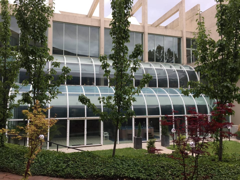 Blick vom Parkplatz auf den Pool-Bereich