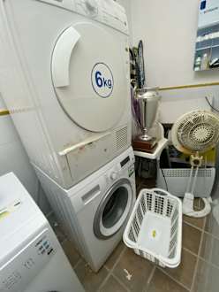 Unaufgeräumter Raum mit notdürftig reparierten Trockner