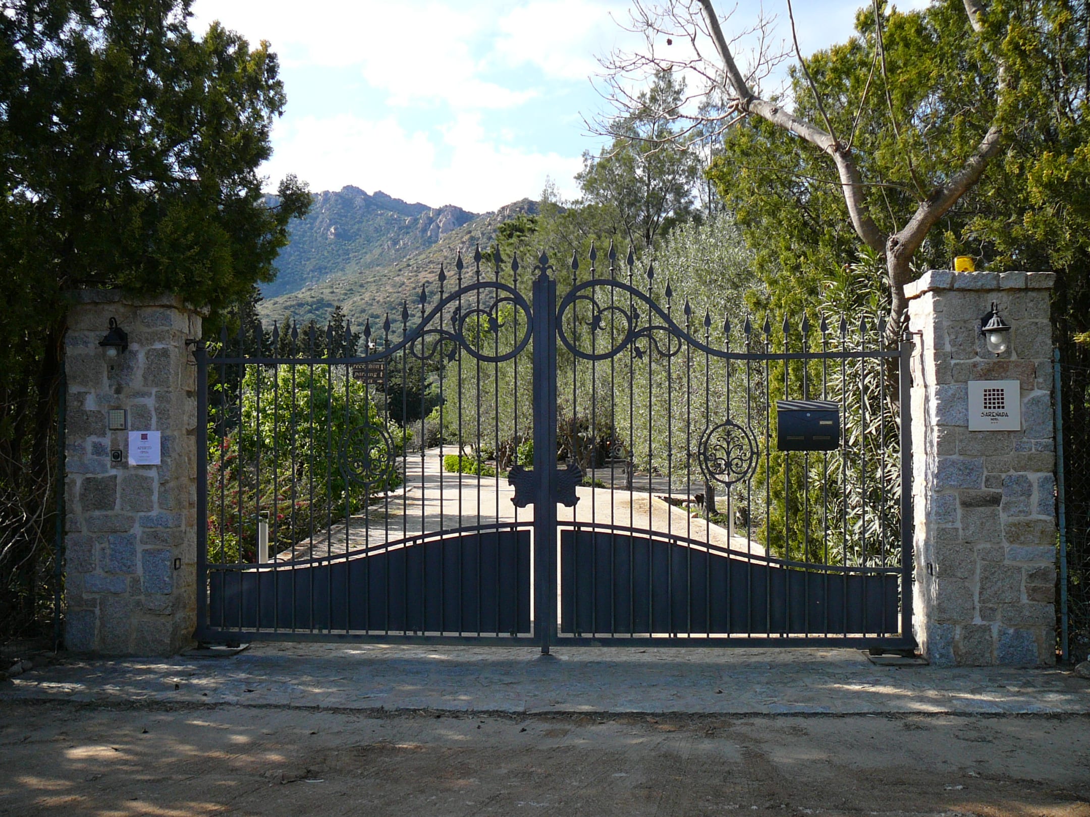 Eingangstor, Zufahrt und Berge im Hintergrund