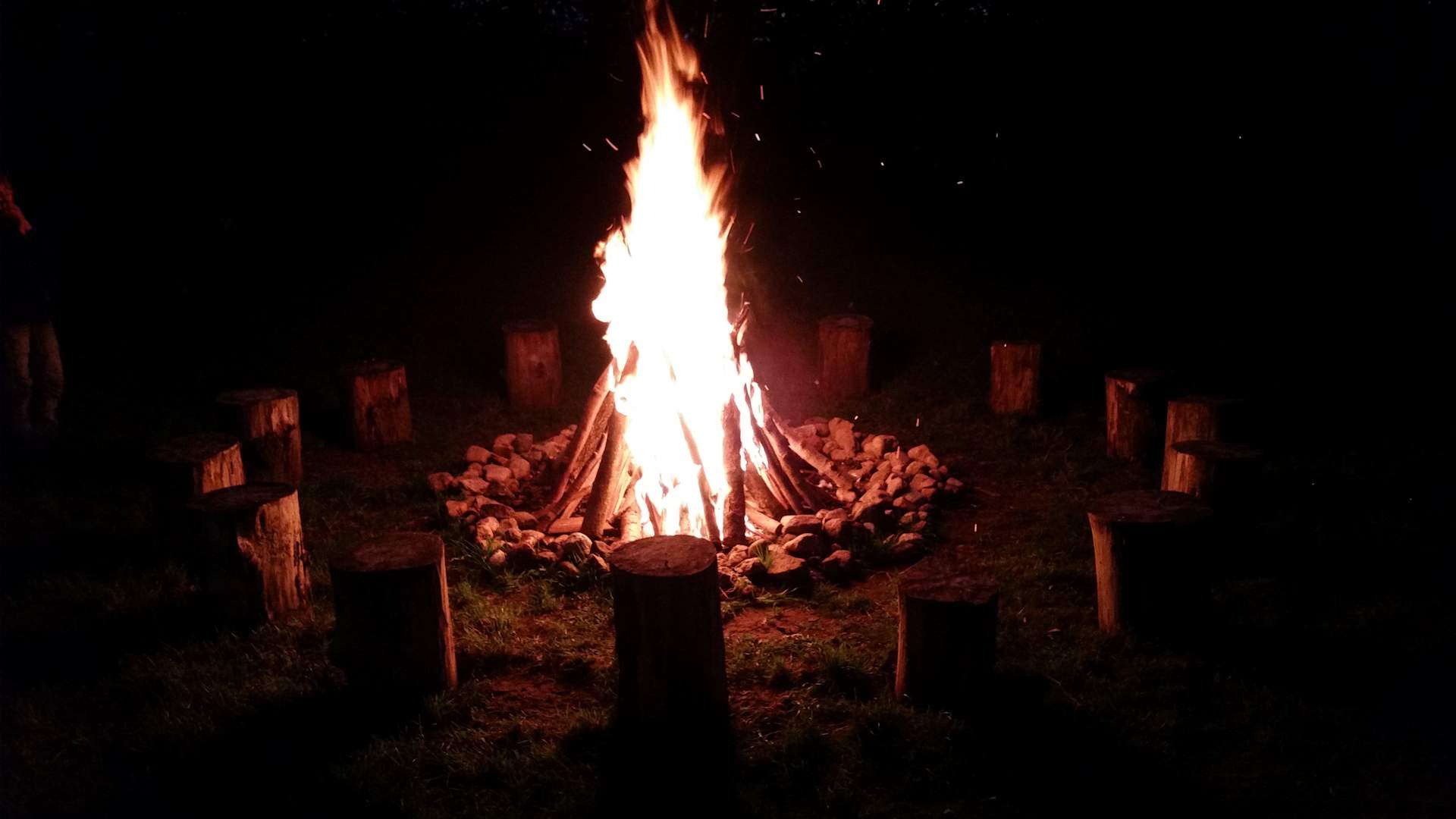 Schönes Lagerfeuer mit Stockbrotessen
