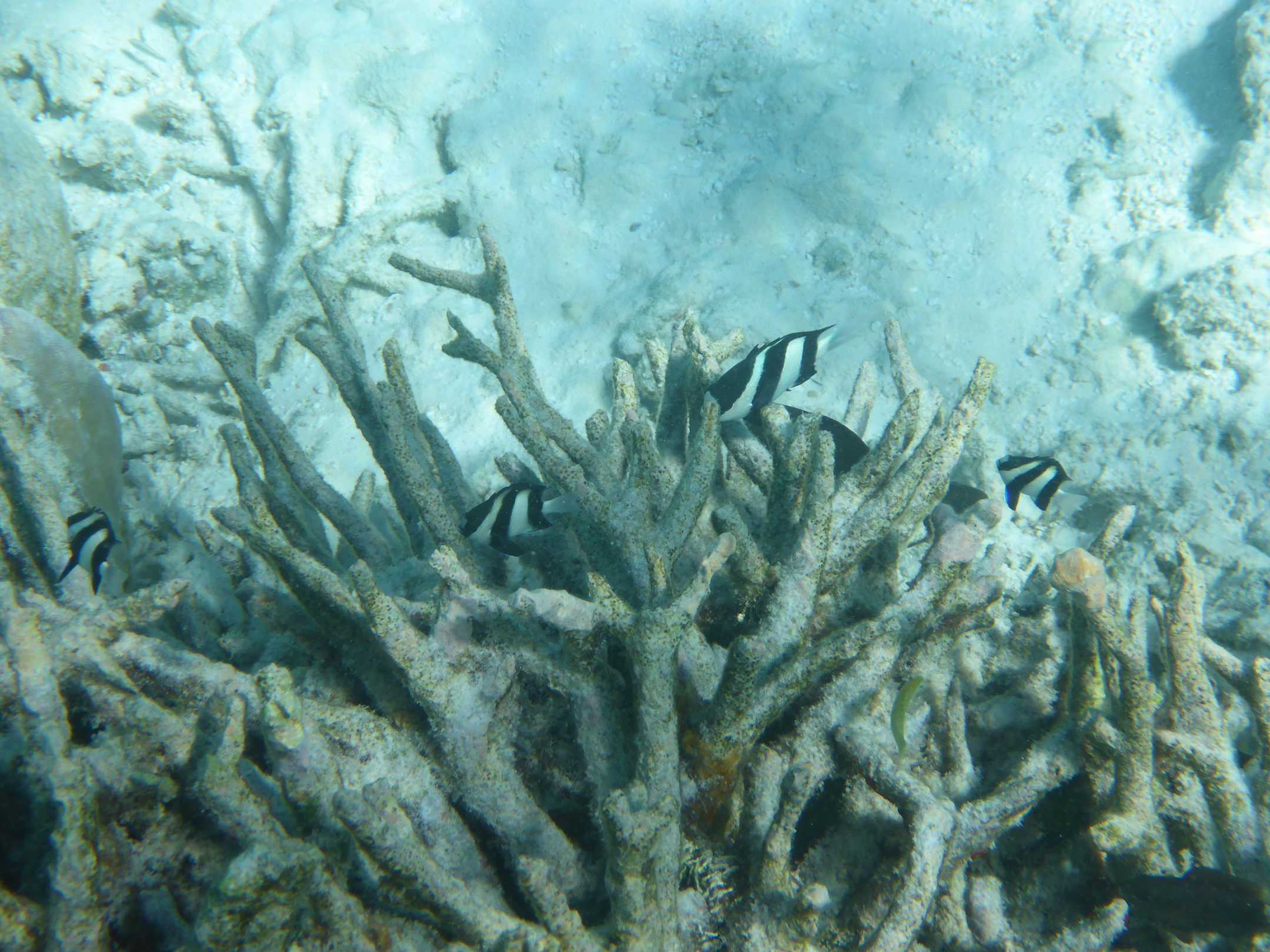 trotz toter Koralle die Korallenbarsche nutzen dies noch als Schutz