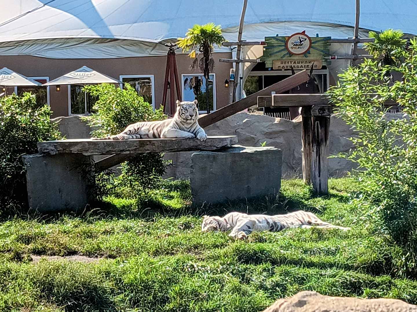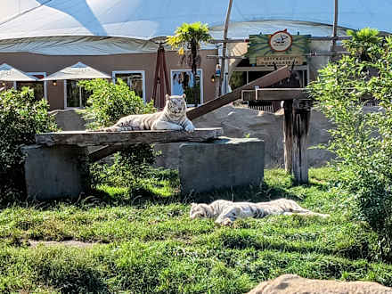 Weiße Tiger vorm Restaurant, wo man Frühstück und Abendessen bekommt