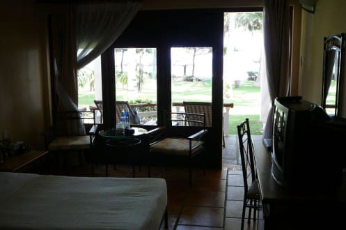 Blick vom Zimmer aus über die Terrasse Richtung Strand