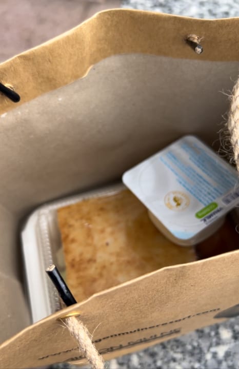 Sandwich, Joghurt, gekochtes Ei, Banane und eine Flasche Wasser.