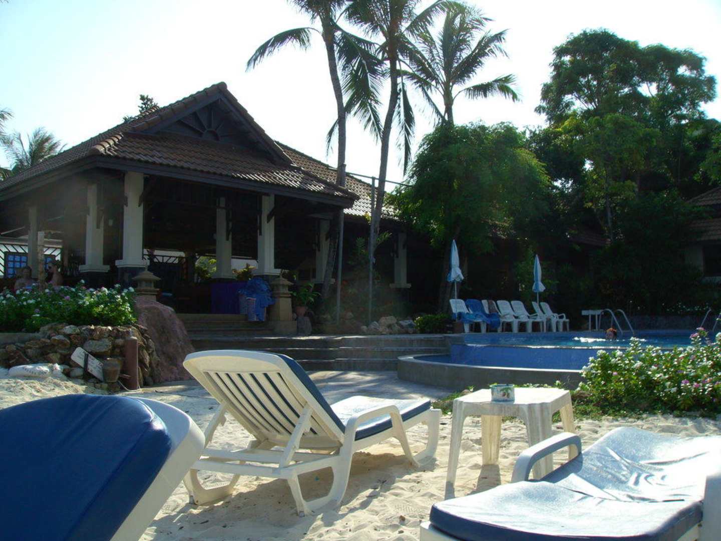 Blick vom Strand auf den Pool