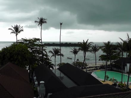 Ausblick Richtung Strand und Nachbarhotel kurz vor dem Gewitter
