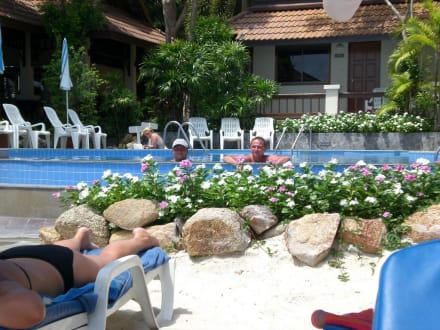 Blick vom Strand auf den Pool und Bungalows