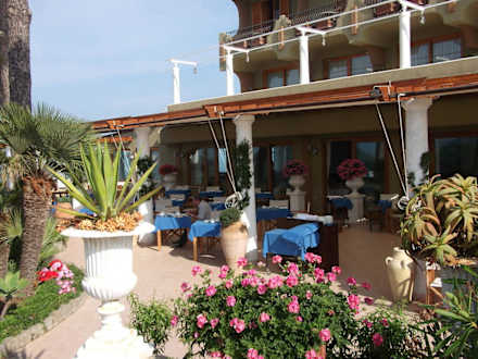 Blick vom Garten auf die Frühstücksterrasse