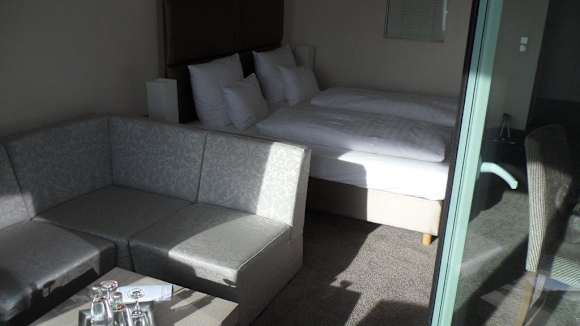 Junior-Suite 405Blick ins Zimmer - Richtung Sitzecke/Bett - von der Balkon-Terrasse aus