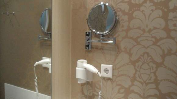Im Bad - Suite 405Rasier-/Kosmetikspiegel, Föhn - gegenüber der offenen Dusche