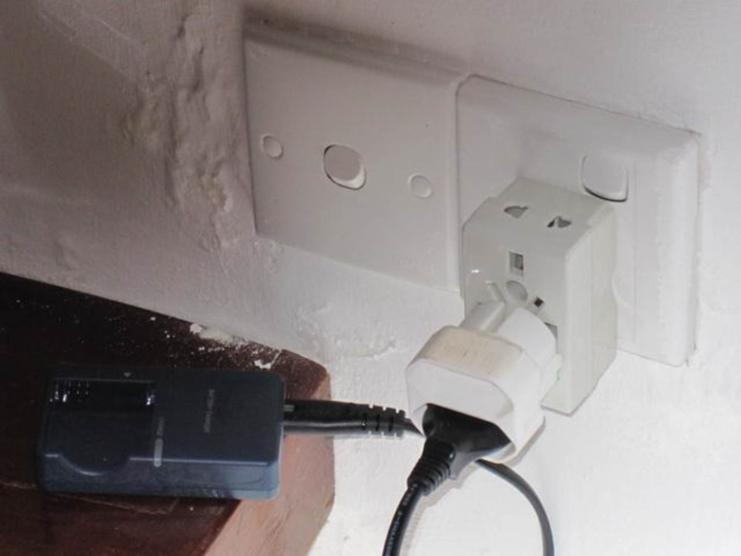 Einfacher Doppelstecker, verstärkt den Halt u. den Kontakt in hoteleigenem Adapter und dient dem Anschluß von zwei Geräten.