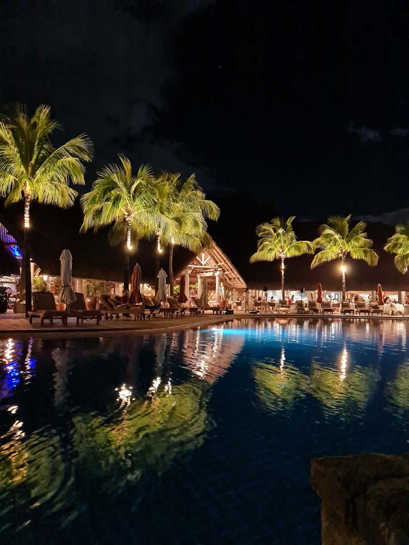 Blick über den Pool bei Nacht auf das Hauptgebäude der Anlage.