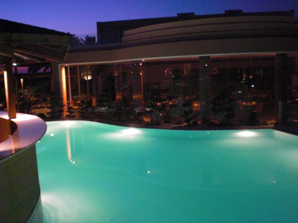 Hinterer Pool am Abend.Blick von der Brücke zur Bar, links Bar, gerade zu italienisches Restaurant.