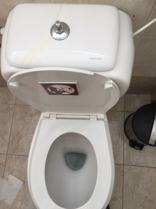 ZimmerZimmertoilette Spülkastendeckel gerissen, benutztes Toilettenpapier soll in nebenstehenden Eimer, toll und stinkt.