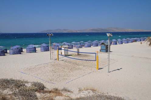 Beach-VolleyballWeil der Sand ab mittags sehr heiß werden kann, wird die Fläche im Spielfeld mit Wasser befeuchtet und gekühlt