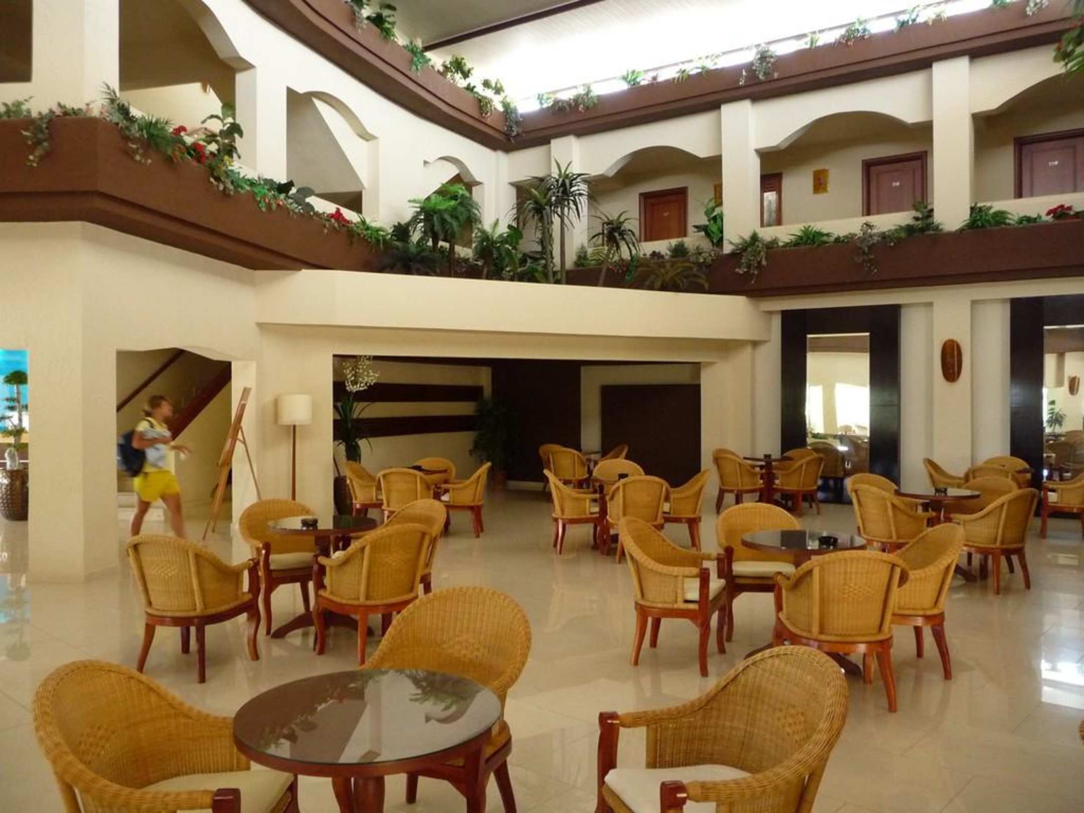 Lobby. Oberhalb sind die Zimmer im Haupthaus