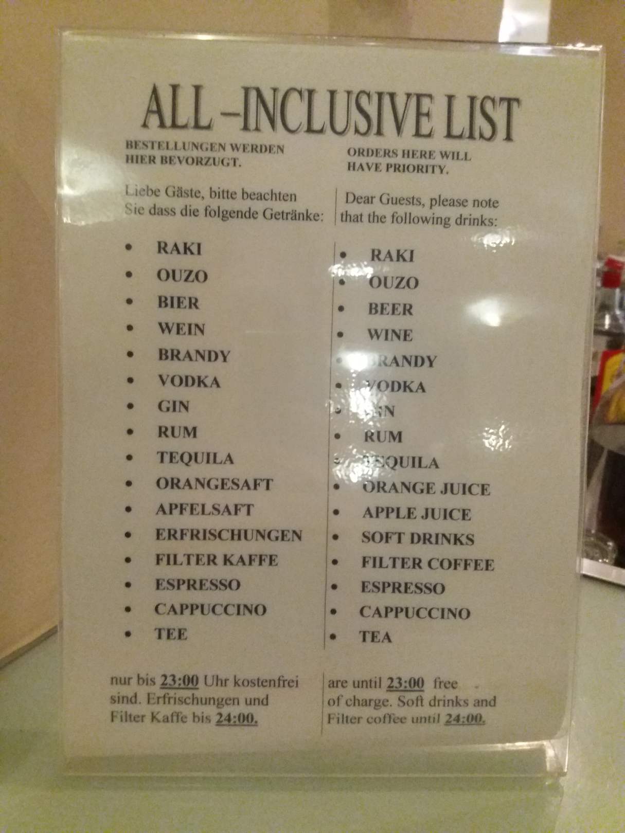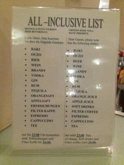 Getränkeliste, was nicht zusätzlich kostet, wenn man allinklusive gebucht hat
