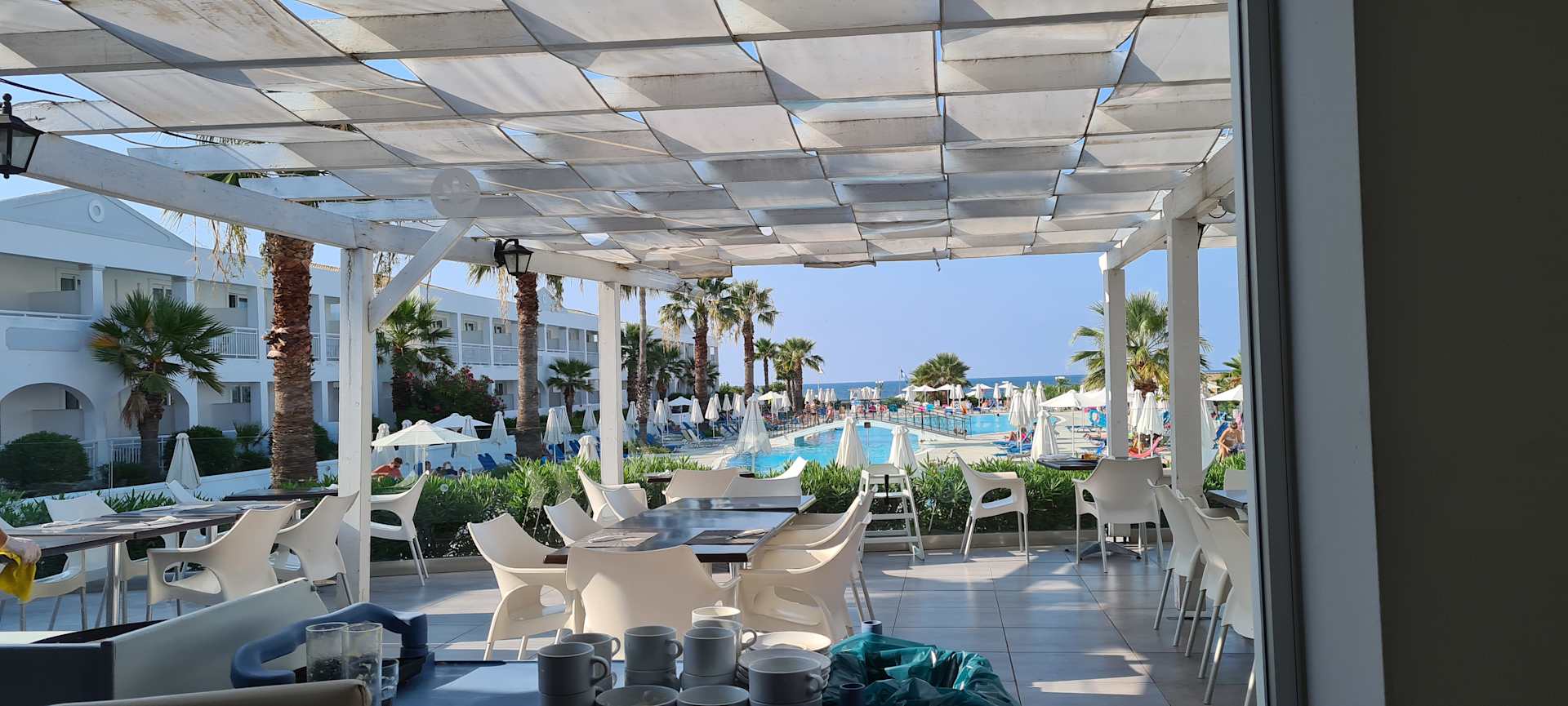 AusblickDer Außenbereich des Speisesaals genießt einen schönen Ausblick auf den Pool und das Meer.