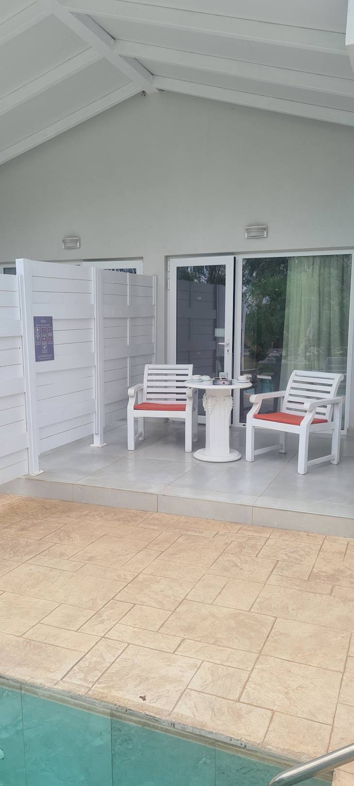 Pool, Sonnenterrasse mit Liegen und Schirm sowie kleine überdachte Terrasse mit Sitzgelegenheiten