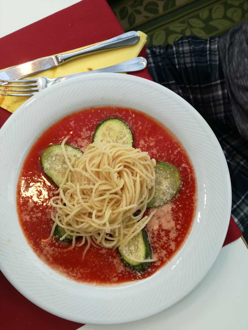 Alternativ als Hauptmenü. Spagetti in Tomatensoße. Auch stehen gelassen.