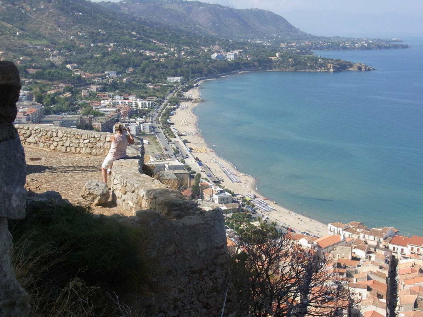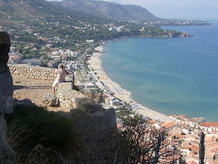 Blick vom Rocca di CefaluDas Santa Lucia ist im Hintergrund ca. in der Bildmitte zu sehen. Davor, am breiteren und viel schöneren Sandstrand liegt das Hotel Tourist. Das größere helle Hotel, ebenfalls direkt am Strand, ist das sehr zu empfehlende Cefalu Sea Pallace