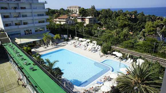 PanoramaOto panorama z naszego okna na hotel, restaurację, basen hotelowy i oczywiście morze.