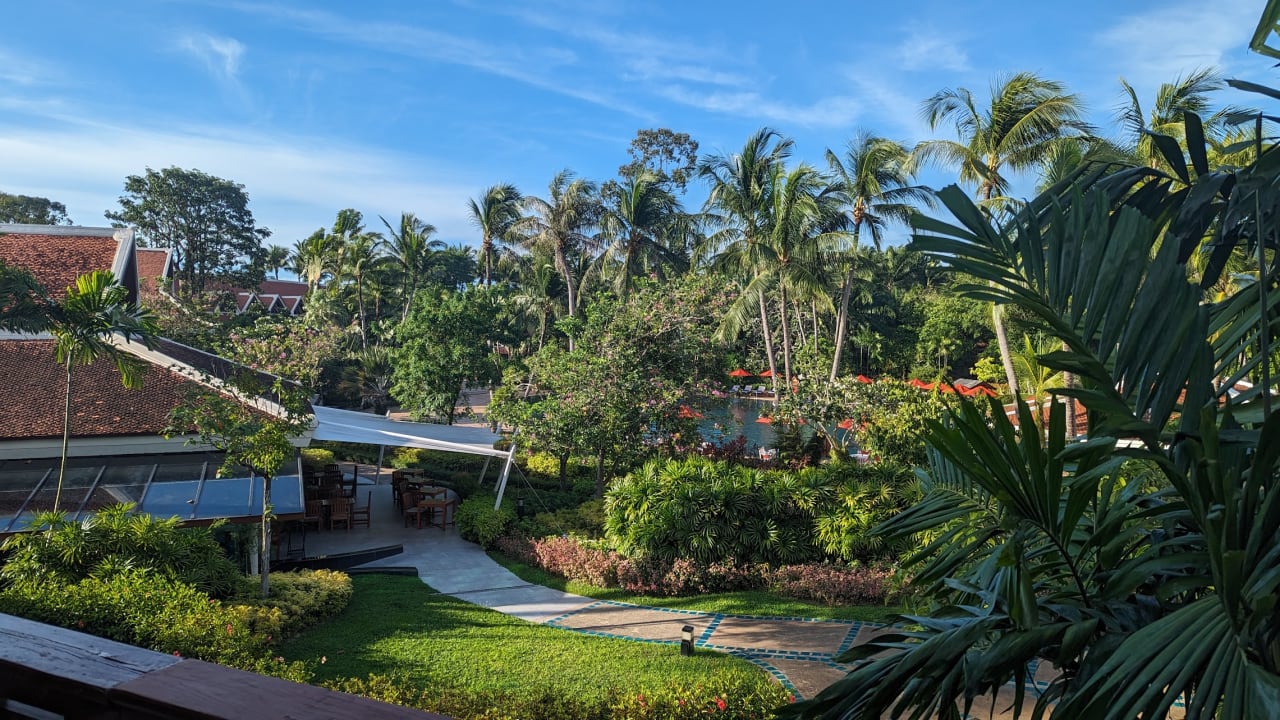 Blick vom Balkon auf die Gartenanlage, im Hintergrund der Poolbereich
