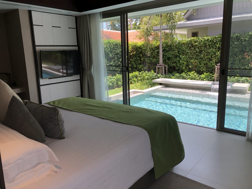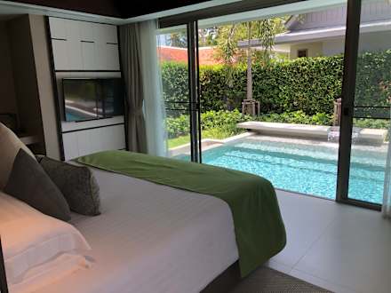 Schlafzimmer mit geöffneter Schiebetür zum Pool