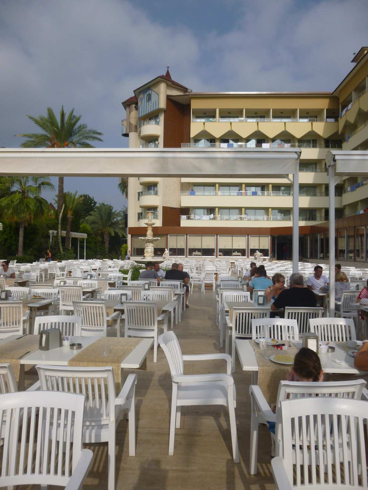 Außenrestaurant mit zahlreichen Sitzplätzen, morgens und mittags nur zur Hälfte gedeckt