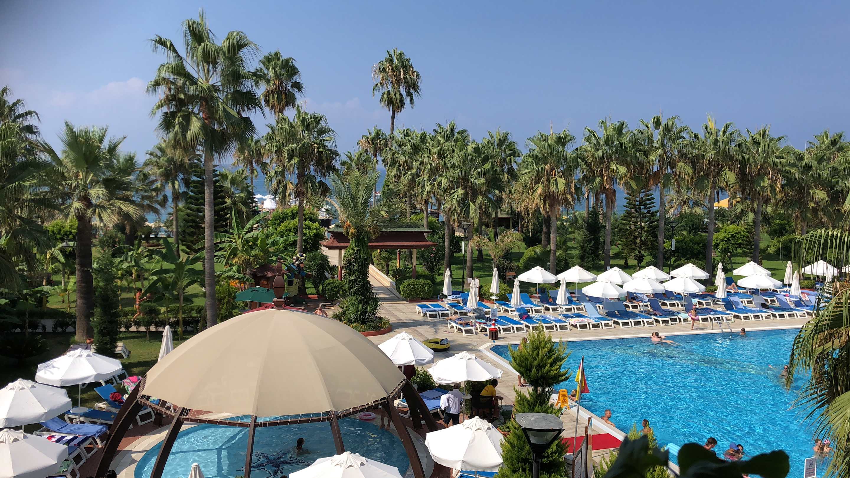 Ausblick vom Zimmer auf die Poollandschaft und das Meer .