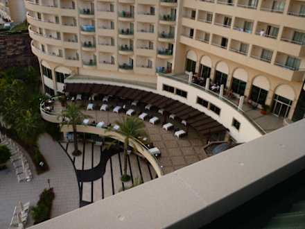 Von unserem ZimmerDie obere Terasse gehört zur Lobby, die darunter ist das Restaurant und ganz unten der Bereich zum Pool