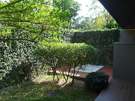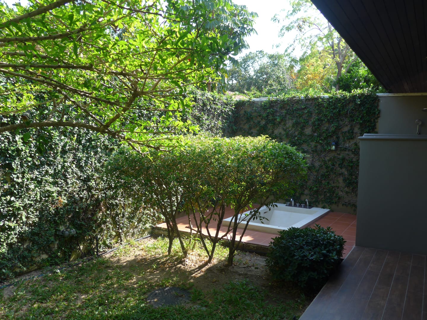 von Mauern umgebener privater Garten mit eingelassener Badewanne und Dusche rechts