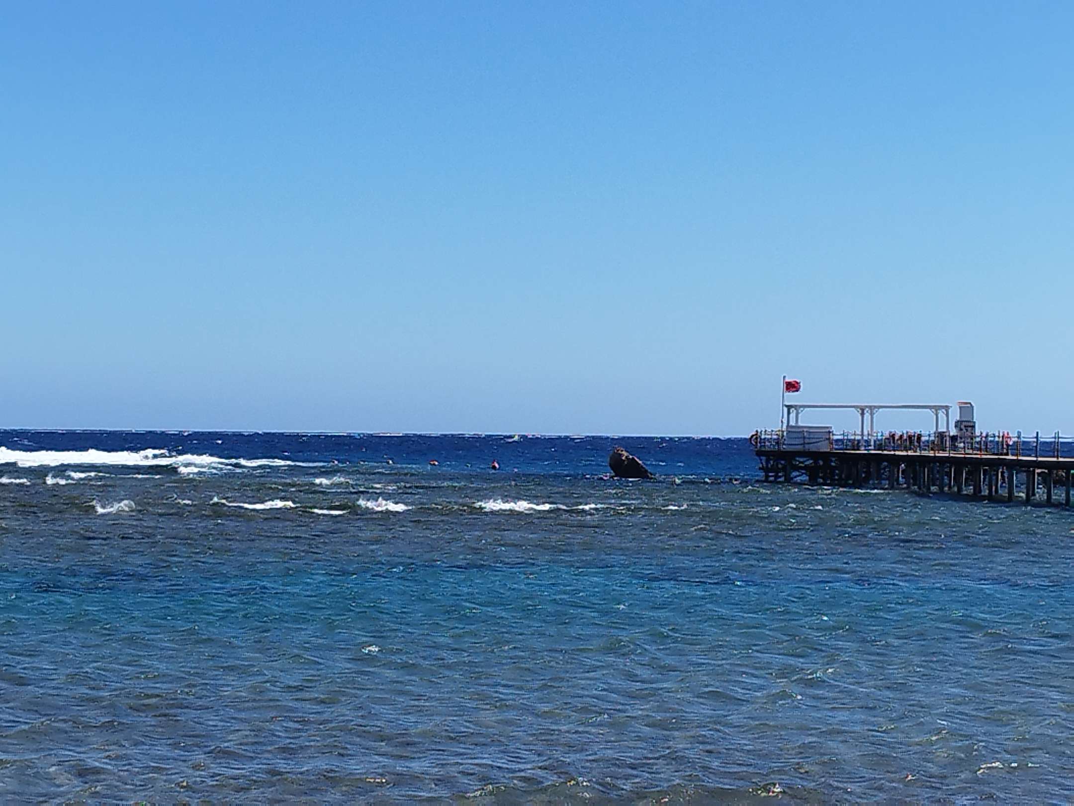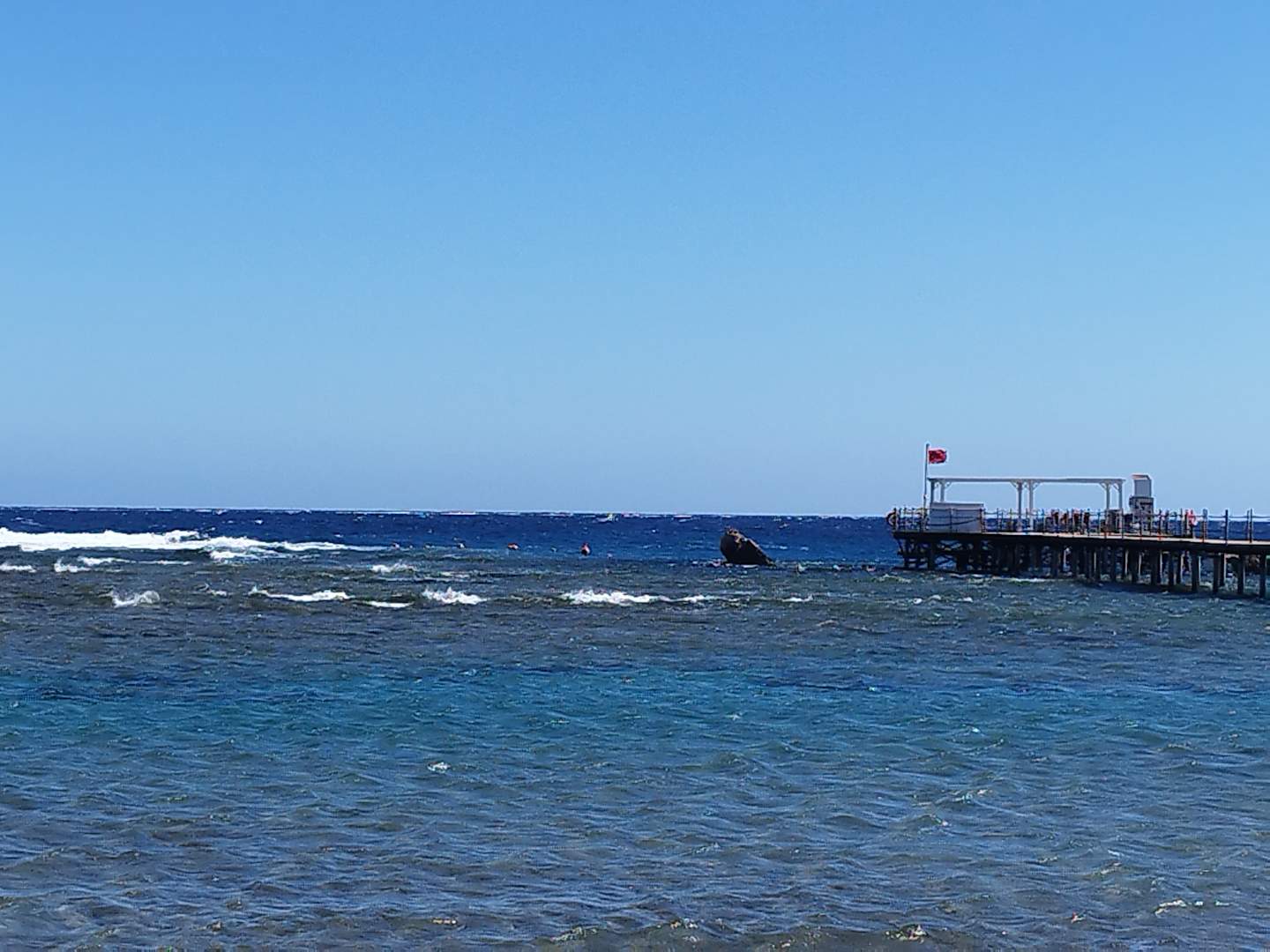 StrandRiffdach und Steg (rote Flagge) Ich war bei gelb schnorcheln und die Strömung war noch gewaltig.