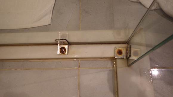 HAUS 19 so sieht die Dusche in einem der teureren premium-MB-ZI aus - verrostete Schrauben und undicht - nach dem duschen steht das Wasser ausserhalb der Dusche auch die Seifenablage rostet, die Fliesen sind gesprungen, die Mauer verschmutzt.