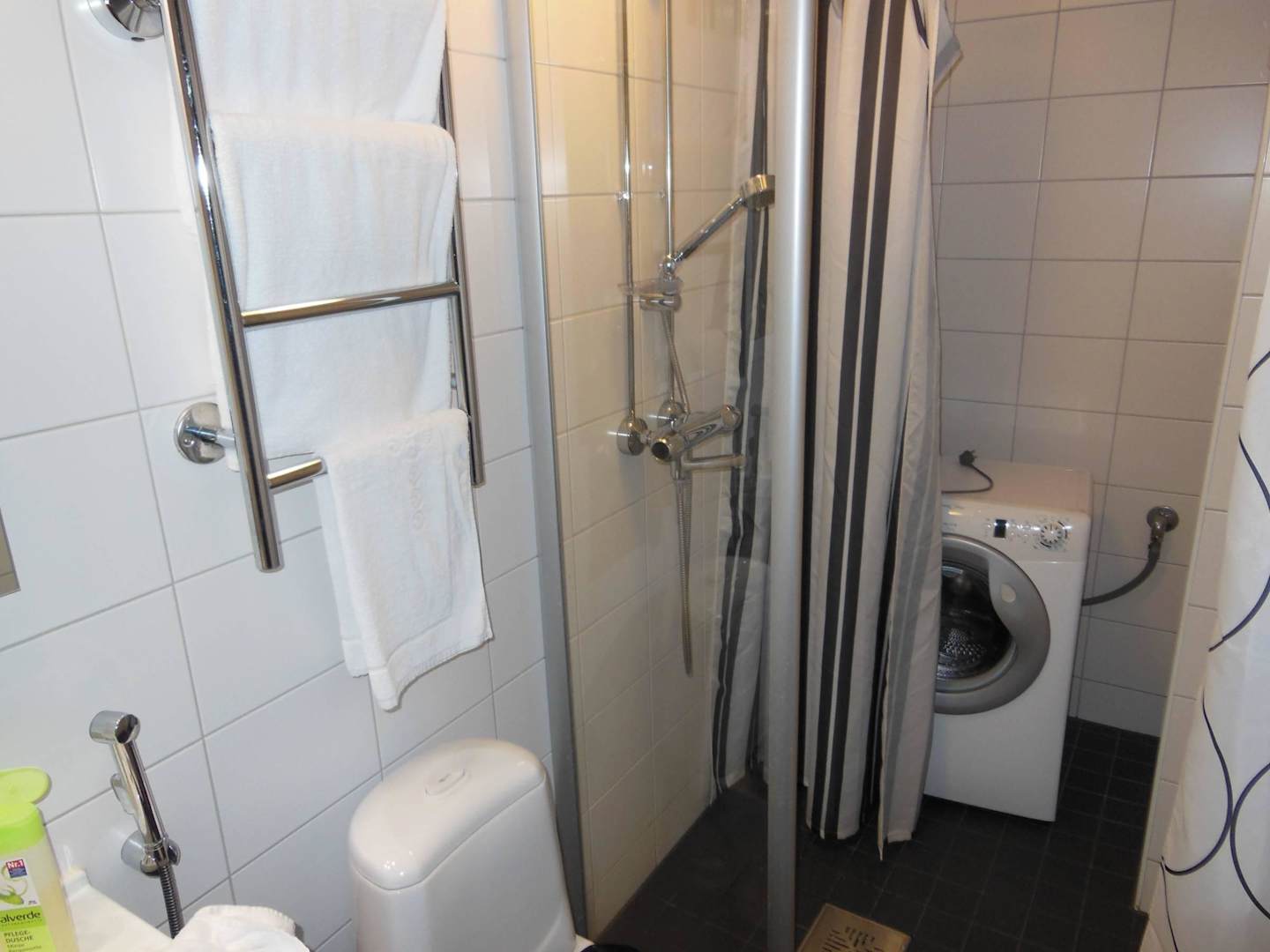 Dusche und Waschmaschine (hinter Duschvorhang)