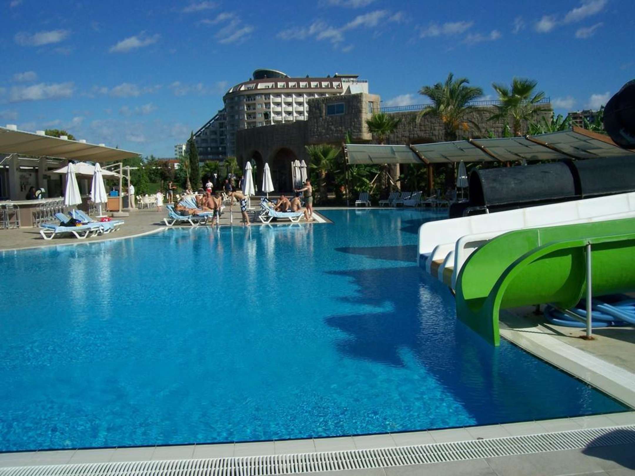 Blick vom Rutschenpool zum Hotel