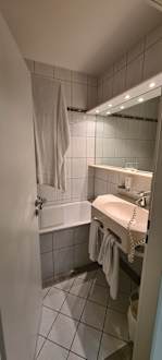 Das Badezimmer ist sehr klein mit sehr hoher Badewanne