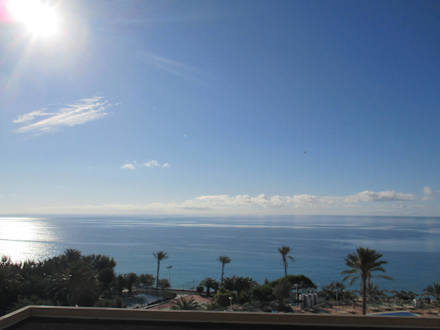 Blick vom Hotelbalkon auf das Meer und den Pool