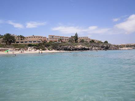 Hotel und Strand vom Meer aus