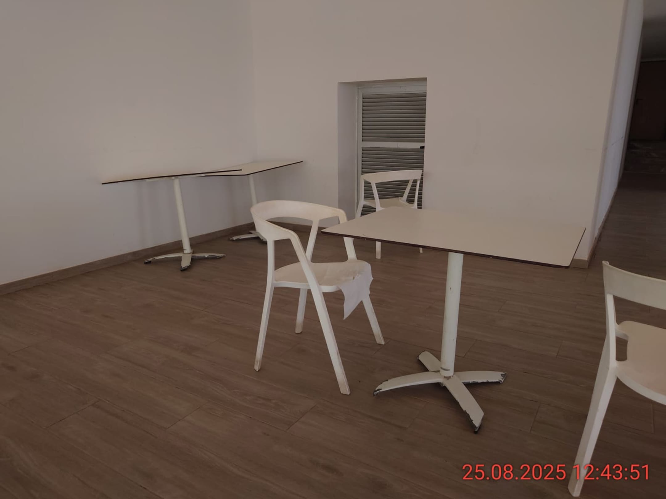 Stühle und Tische alt und dreckig. Defekte Tische stehen in den Ecken herum.
