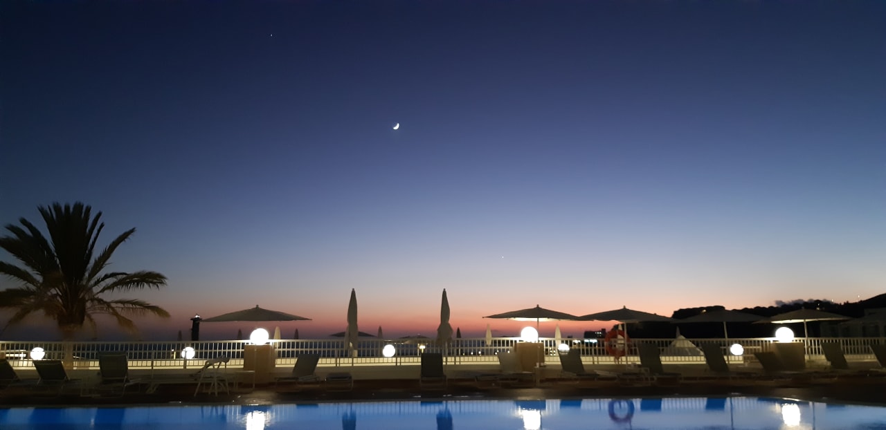 Ausblick von Bar über Pool am Abend