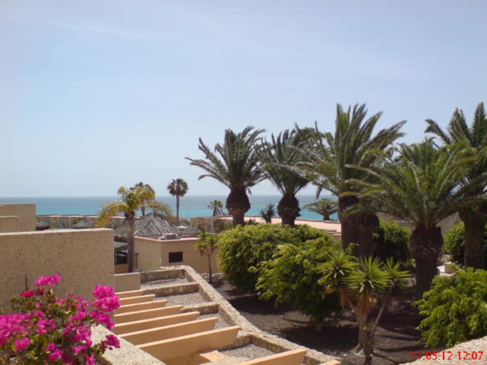 Blick vom Zimmer über den Garten zum Meer