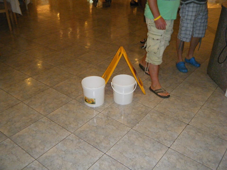An manchen Tagen tropfte Wasser von den Wänden, Eimer wurden aufgestellt. Bild ist IM Speisesaal aufgenommen wurden...