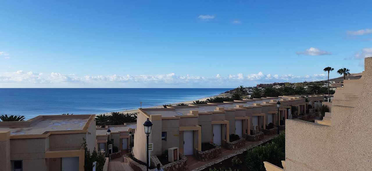 Morgens vom Balkon aus die Anlage und der Strand zu sehen.