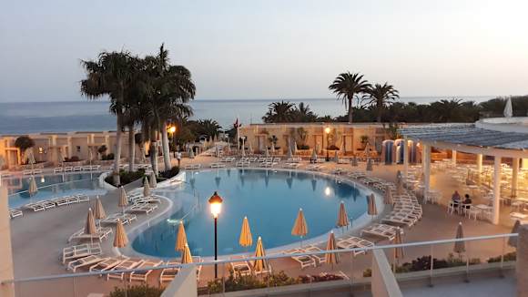 Blick vom Balkon über Pool und Hotelanlage