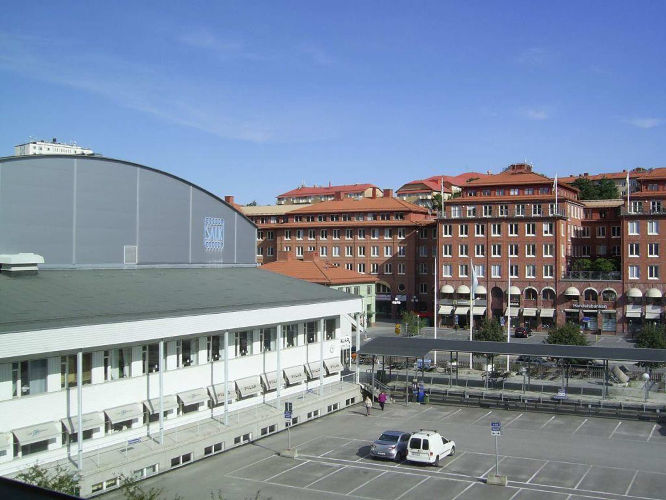 Vor dem Hotel-EingangMan sieht hier den Parkplatz d. benachbarten Tenniscenters vor d. Hotel u. im Hintergrund d. Alviker Markt (dort ist z. B. ein Supermarkt u. e. nettes Café, etc.). Links geht es zur S-/U-Bahn, rechts zum See u. d. Restaurants dort.
