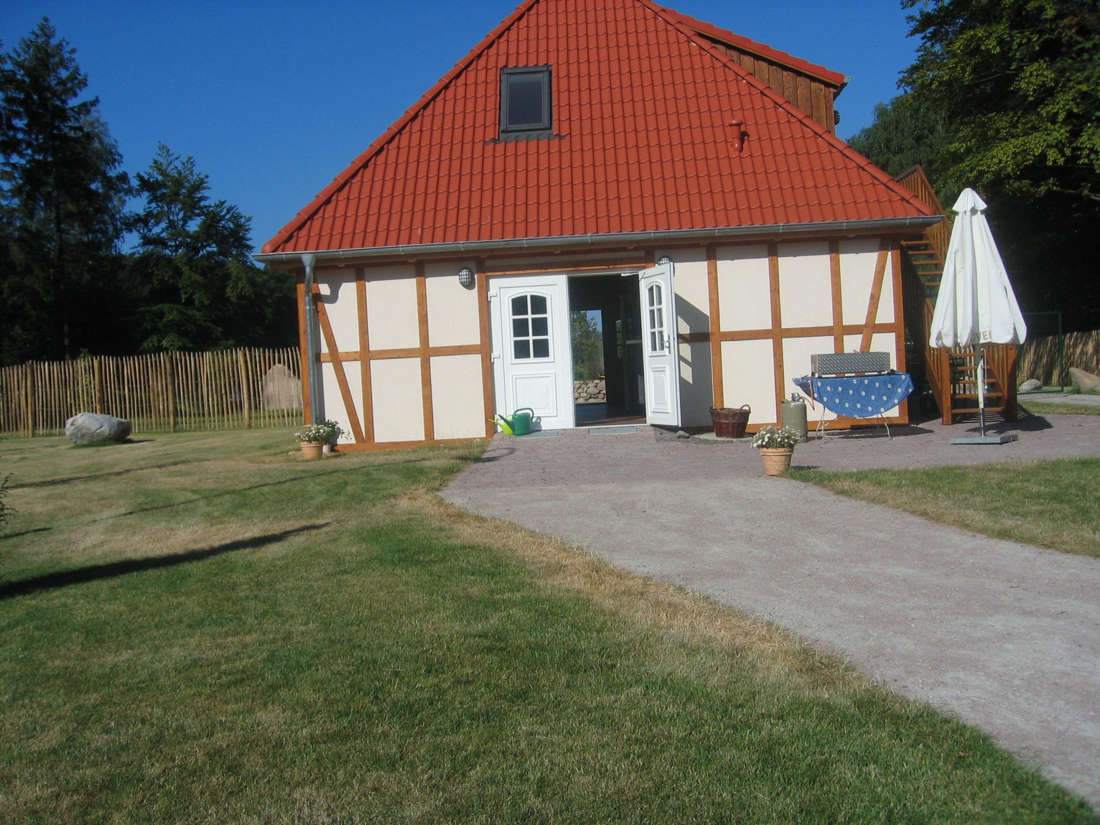 Der Weg zur Rezeption, davor ein Gas-Grill für jeden nutzbar