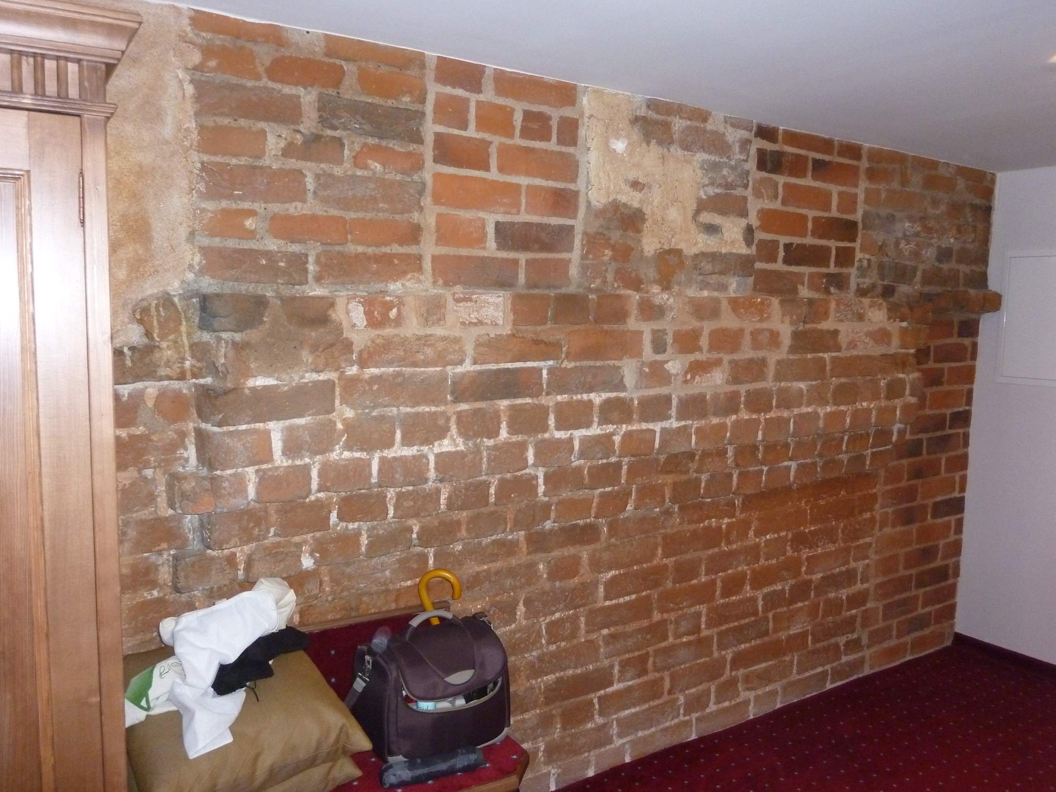 Hier hat man die originale Wand des alten Gebäudes sichtbar gelassen.