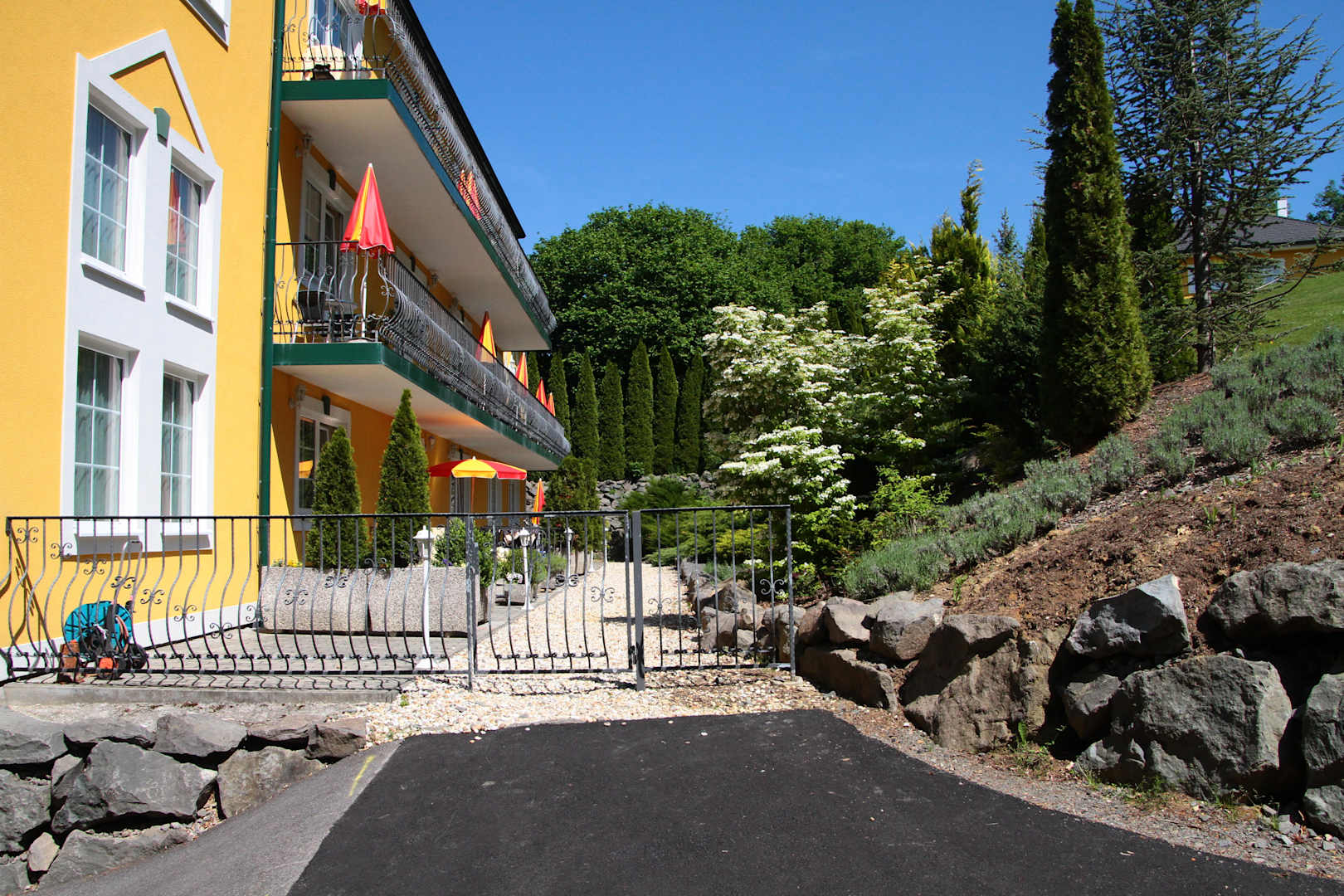 Der offene Sonnenschirm zeigt unsere Terrasse