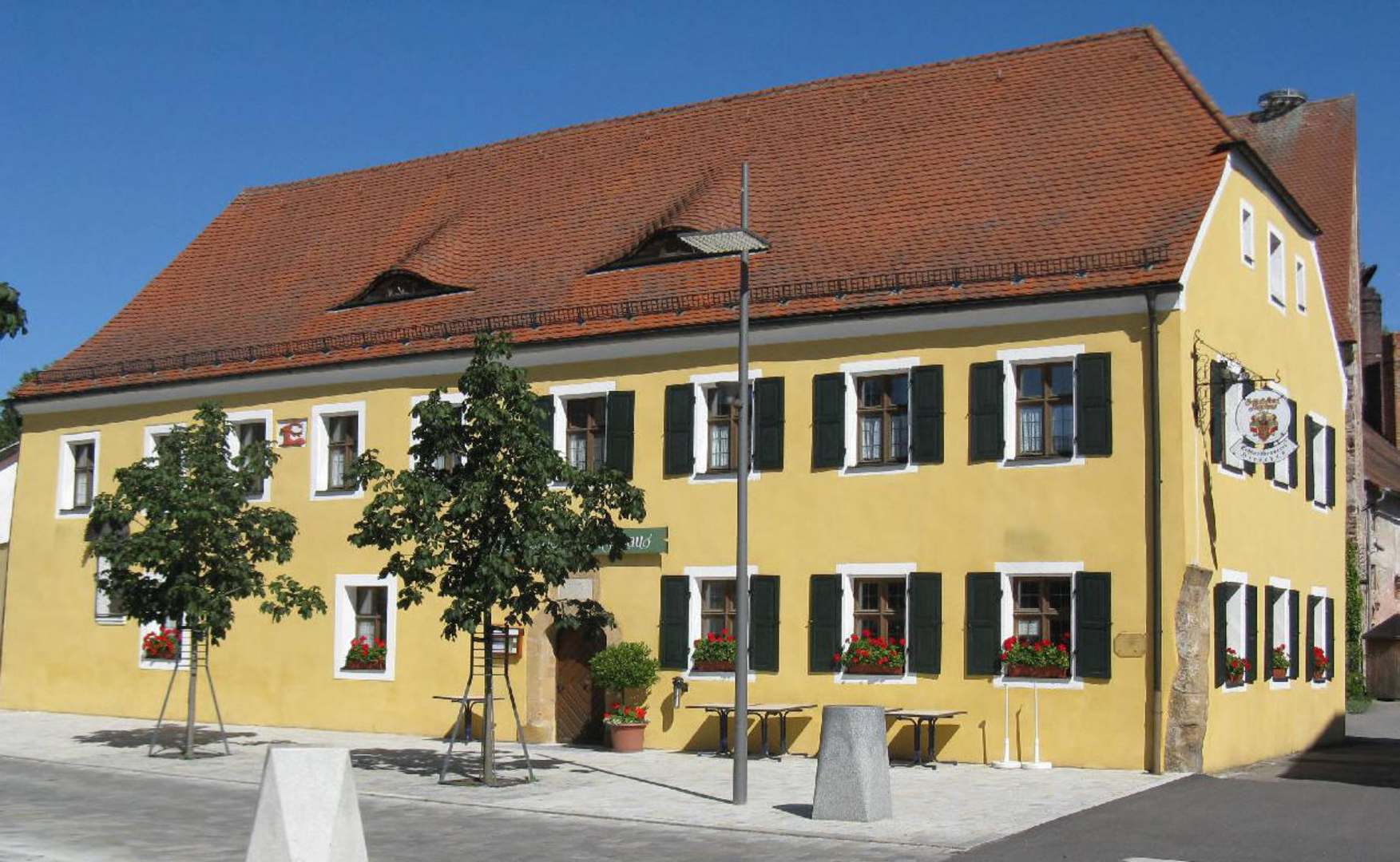 Hotelansicht Marktplatz kommendAnsicht des Hotels vom neu gestalteten Marktplatz aus gesehen. Rechts vom Hotel befindet sich die Zufahrt zum eigenen Parkplatz. Im Hintergrund sieht man das Dach des ehemaligen Pflegschlosses und dahinter die alte Mälzerei vorspitzen.